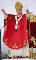 The pope read his sermon seated on a white throne under a stylized golden tree, with Spain's King Juan Carlos and Queen Sofia looking on. A choir and orchestra dressed in blue and adorned with white lilies accompanied the mass.